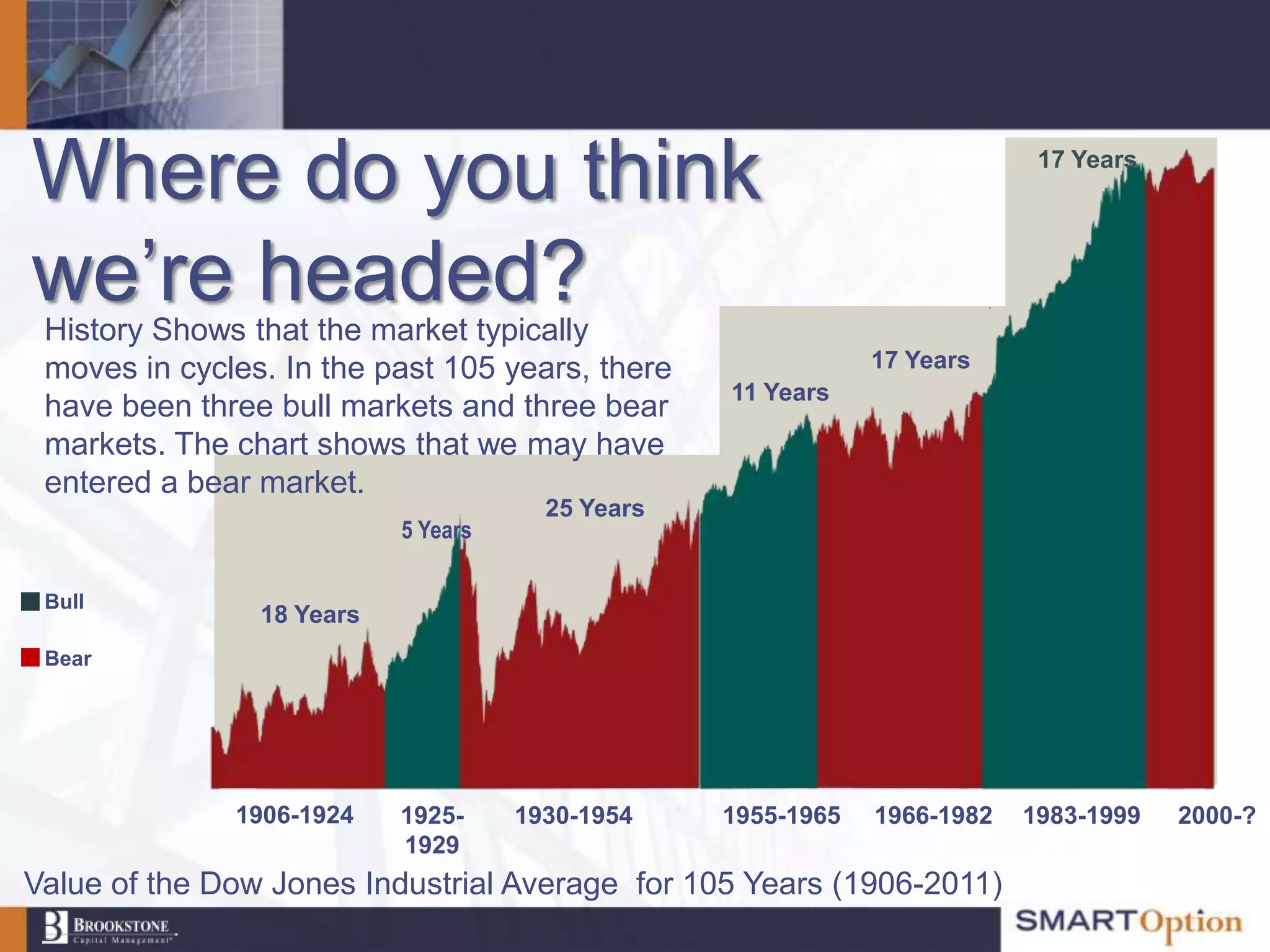 This document discusses various investment strategies including asset allocation, market timing, and buy and hold approaches. It notes that diversification works well until major market downturns, when most asset classes tend to decline together. The document then discusses how options strategies can be used to generate income, hedge risk, diversify a portfolio, and lock in profits. It provides examples of how put options, covered calls, and selling cash-secured puts work. The document concludes by outlining the two-basket approach used by SMARToption - Basket I invests in equities hedged with long-term put options, while Basket II independently generates income by selling short-term puts and calls. Historical performance data is presented showing how SMART