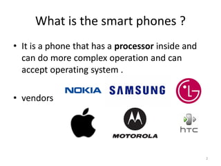 Smart phones have processors that allow them to perform complex operations and run operating systems. Apple iPhones have strong materials, good hardware, cute designs, robust yet secure software, but are high cost with closed systems. Samsung Galaxies also have good hardware and designs, robust software, lower cost, and open systems, but less secure software. Key smart phone specifications include LCD screens, cameras, media players, GPS, WiFi, batteries, touchscreens, and sensors. Chinese phones may have lower quality materials and components, lower energy budgets, and lower costs, but could impact health and have defects. When choosing a smart phone, it is important to determine your needs to select the best specifications and suitable device.