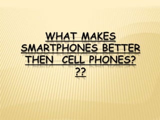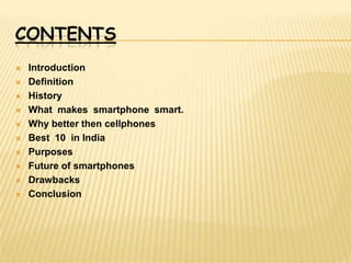 The document discusses the history and features of smartphones. It notes that the first smartphone, the IBM Simon, was released in 1992. Smartphones combine the functions of a cellphone and a personal digital assistant (PDA) by allowing apps, internet access, and integration of phone and computing capabilities. The document lists the operating systems, processors, cameras, and other specs of 10 top smartphones in India and discusses potential future uses of smartphones like mobile banking and medical devices. It concludes by tracing the evolution of smartphones from early clunky models to today's powerful multimedia devices.