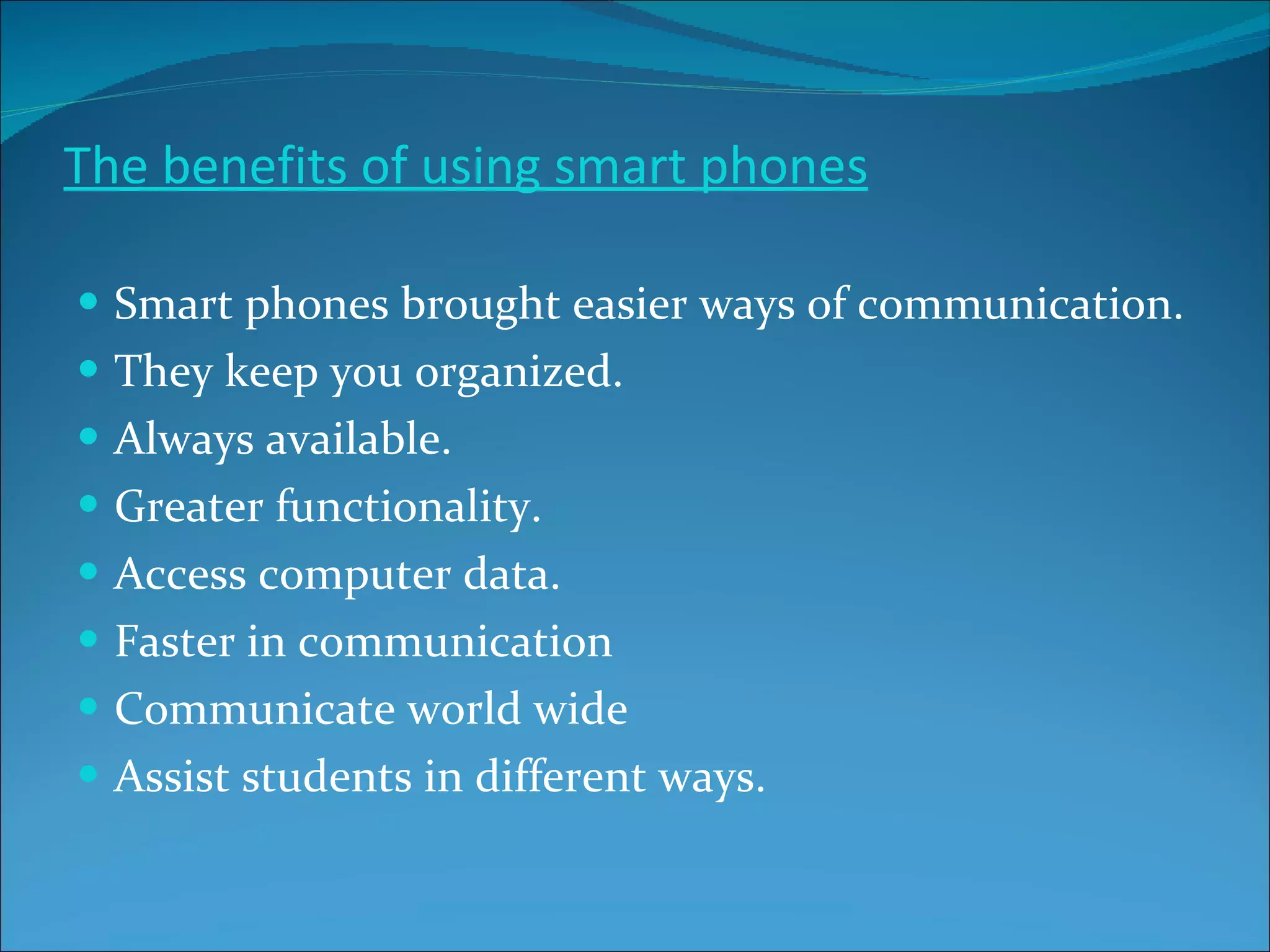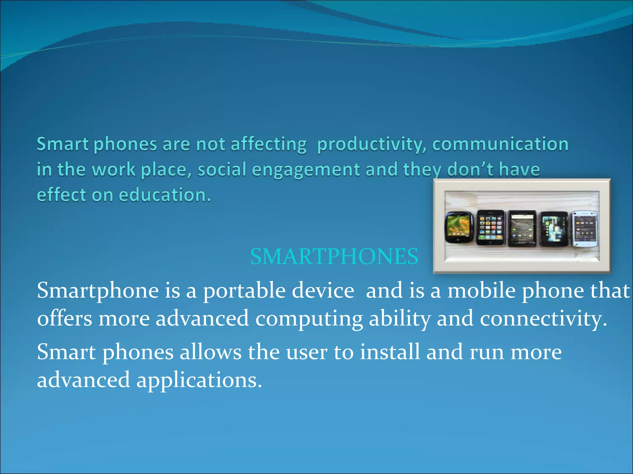 Smartphones are mobile phones that offer advanced computing abilities and connectivity beyond basic phones. They allow users to install apps and access the internet. Smartphones bring benefits like easier communication, organization, and access to computer data and information from anywhere. They are widely used in work, education, and social contexts. In work, smartphones improve communication between employees and allow companies to advertise online. In education, smartphones give students access to online information and resources to help with assignments. Different smartphone platforms include iOS, Android, and others. Global smartphone sales nearly doubled in 2010, with the US as the largest market. Smartphones have become integrated into daily life for work, social, and educational purposes.