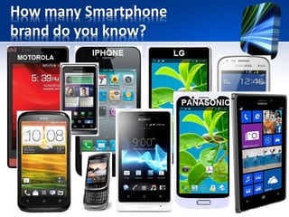 The document discusses smartphones, including that a smartphone is a cellular phone that can perform computer functions with an operating system capable of running applications. It notes that the top smartphone platforms in 2012 were Android at 72% and iOS at 14%, and in the US in 2013 Android was 48% and iOS was 43%. Additional facts provided include that as of 2014 there were over 1.7 billion smartphone users worldwide, comprising one in five people, and that in the US 56% of adults own smartphones, with highest ownership among 25-34 year olds. The document also lists various uses of smartphones like calling, texting, internet, cameras, and games.