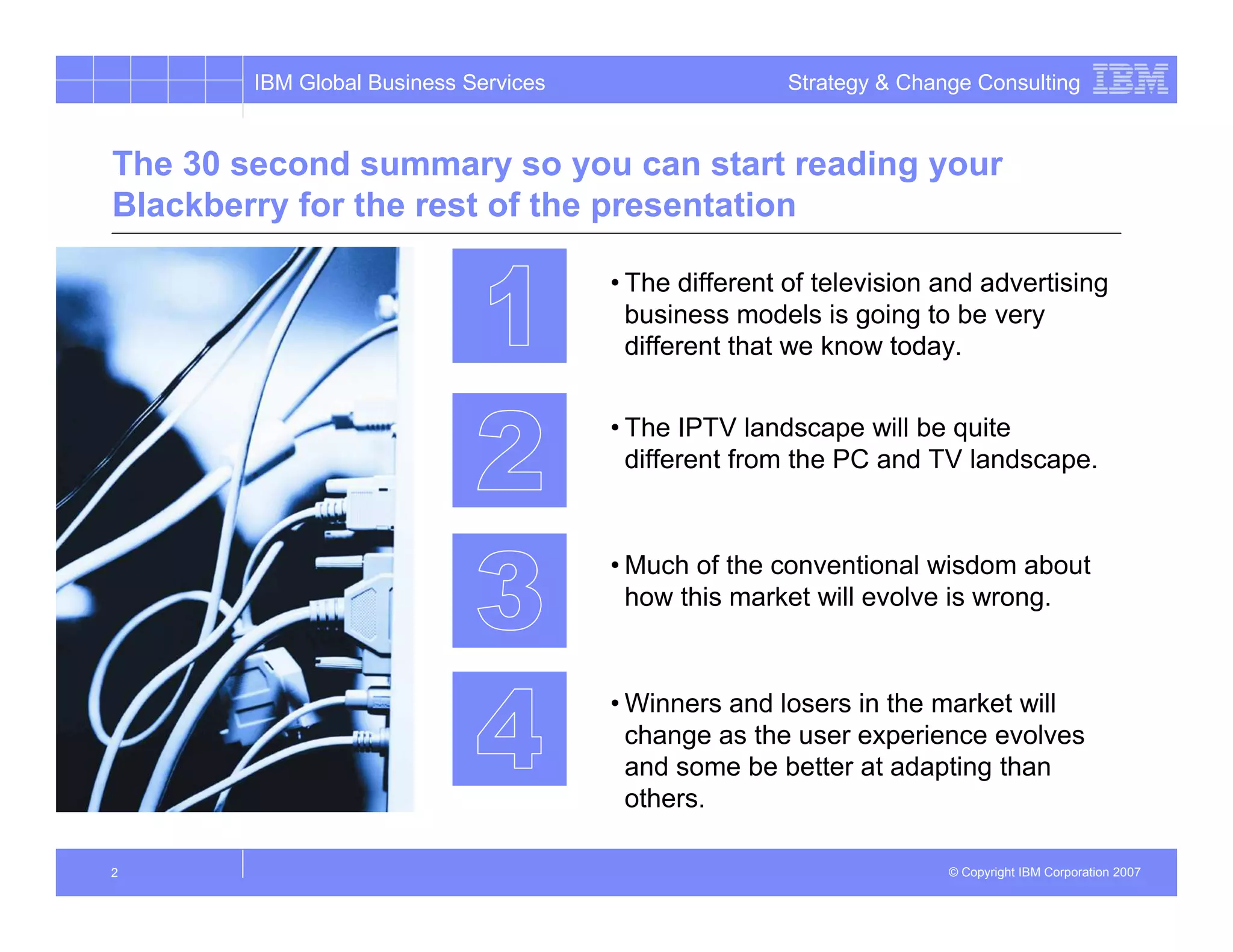 3) Two evolutionary paths are clashing - the "smart devices" path led by internet companies and the "smart pipes" path of cable and telecom companies trying to lock in users and control the experience. The conventional wisdom about how this clash will be resolved is challenged.