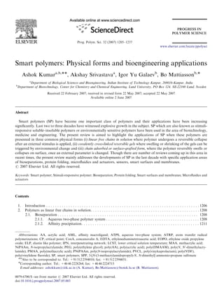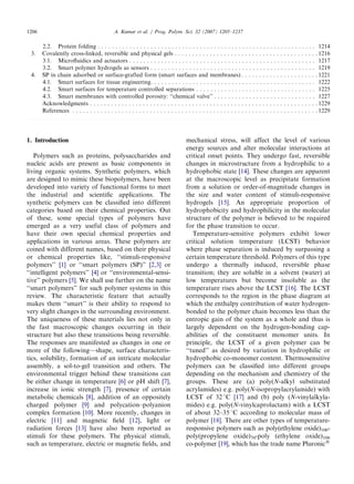 This document summarizes applications of smart polymers over the last decade. Smart polymers, also known as stimuli-responsive polymers, can change their physical form in response to environmental triggers like temperature, pH, ionic strength, and electric or magnetic fields. The review discusses three common physical forms of smart polymers and their bioengineering applications: 1) linear chains in solution that collapse or dissolve in response to stimuli, 2) covalently cross-linked gels that swell or shrink, and 3) surface-grafted polymers that swell or collapse surfaces. Key applications discussed include bioseparations, protein folding, microfluidics, sensors, and smart surfaces.