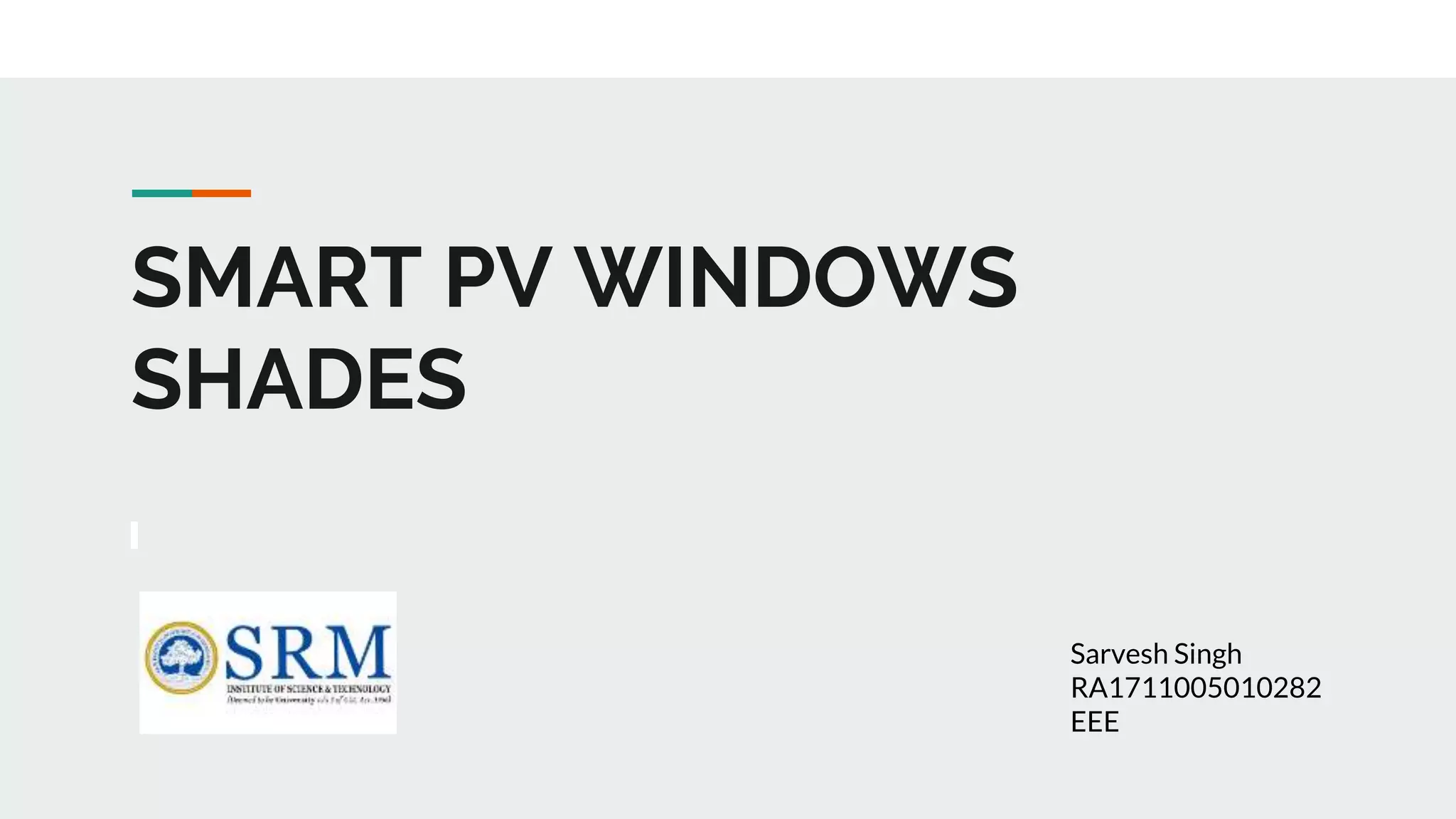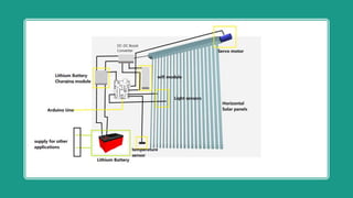 This document discusses the development of smart PV window shades that can help reduce energy consumption and provide privacy and UV protection. The smart shades are powered by solar panels and use sensors to open and close automatically based on temperature, light levels, and time of day. They reduce air conditioning costs by up to 30% by blocking heat from windows. The project design uses an Arduino, battery charging module, servo motor, boost converter, temperature sensor, light sensor, and WiFi module. Future improvements include a mobile app for remote control and automatic rotation based on sunlight angle.