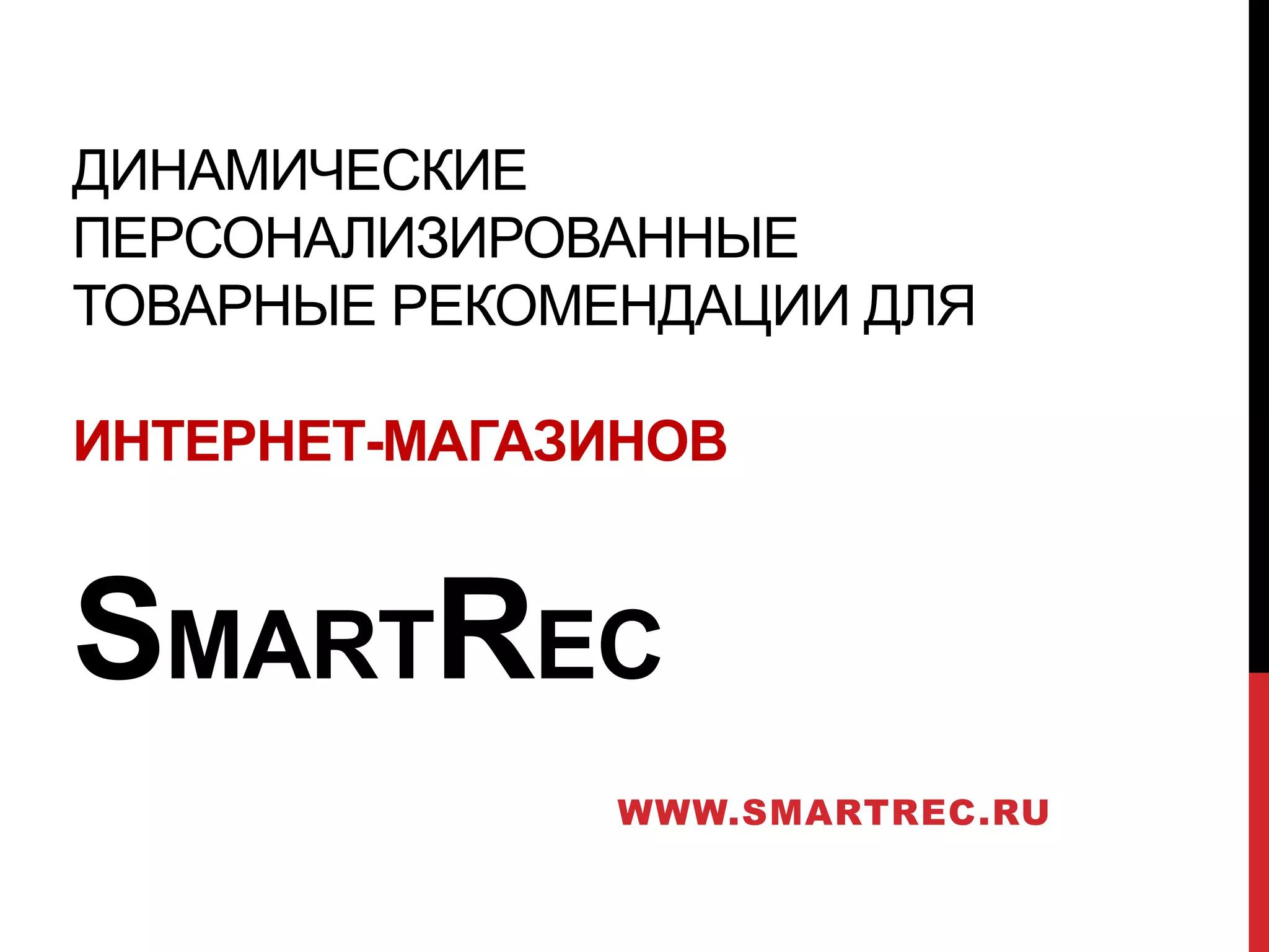 Smartrec предлагает платформа динамически обновляемых персонализированных рекомендаций для интернет-магазинов, что может увеличить конверсию на 10% и общие продажи до 30%. Интеграция системы занимает несколько часов и не требует значительных вложений в разработку, предоставляя алгоритмы коллаборативной фильтрации для адаптации рекомендаций под каждого покупателя. Проект обеспечивает непрерывный мониторинг и поддержку, что делает его доступным и эффективным решением для ритейлеров.