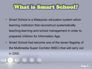 The document discusses Smart Schools in Malaysia. Some key points: