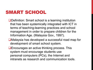 The document discusses the challenging implementation of information and communication technology (ICT) in smart schools in Malaysia. It identifies six main challenges: (1) lack of technological infrastructure and teaching materials such as limited internet connection and shortage of computers; (2) underutilization of existing smart school hardware, software, and courseware; (3) lack of democratization in education where students have no choice in their education; (4) lack of training for teachers in ICT; (5) negative attitudes of experienced teachers towards ICT; and (6) time constraints where using computers is time consuming for both students and teachers.