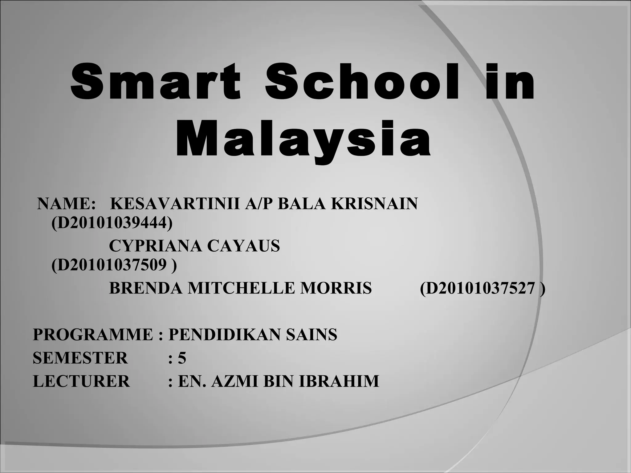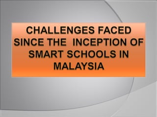 The Malaysian Smart School initiative aims to transform educational institutions with modern teaching and management practices to prepare students for the information age. Launched in 1999, the program has progressed through various stages aimed at making all schools smart by 2020 while emphasizing cooperation from citizens to achieve its goals. The initiative reflects Malaysia's commitment to adapting education in response to technological advancements.
