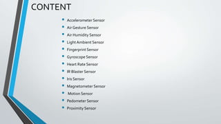 The document provides an overview of various smartphone sensors, including their functions and capabilities, such as accelerometers, gyroscopes, and fingerprint sensors. It highlights the role of these sensors in enhancing user interaction, security, and fitness tracking. Key sensors covered also include air gesture, humidity, ambient light, iris, magnetometer, motion, pedometer, proximity, heart rate, and IR blaster sensors.