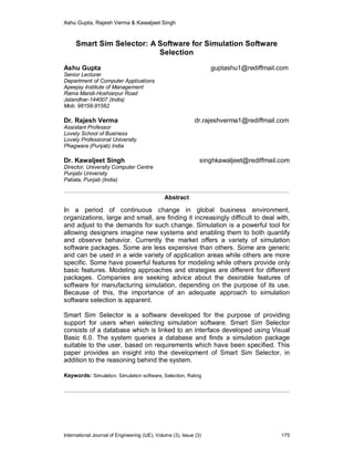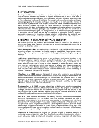 The document discusses the development of 'Smart Sim Selector', a software tool designed to assist users in selecting appropriate simulation software for manufacturing based on specified criteria and requirements. It includes a database of simulation packages and employs various selection techniques like Analytic Hierarchy Process (AHP), Weighted Score Method, and TOPSIS to recommend suitable options. The paper highlights the challenges in simulation software selection and emphasizes the importance of a structured approach to ensure efficient decision-making in a competitive business environment.