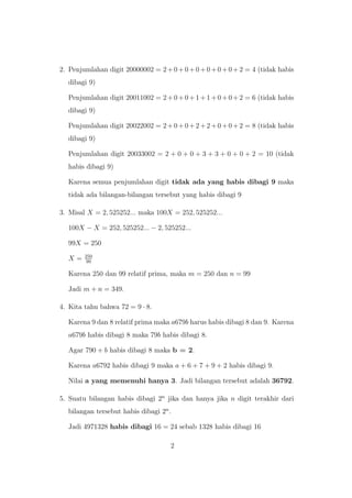 Dokumen tersebut membahas berbagai soal matematika yang terdiri dari teori bilangan, aljabar, geometri, dan probabilitas. Beberapa soal dijelaskan beserta penyelesaiannya secara rinci.