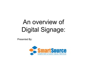 The document discusses digital signage solutions provided by SmartSource Event Technology. It provides an overview of the various digital signage options available including dynamic content like videos, images and text. It also describes how digital signage can enhance events by providing information to attendees, generating revenue through advertisements, and reducing waste compared to printed signs.