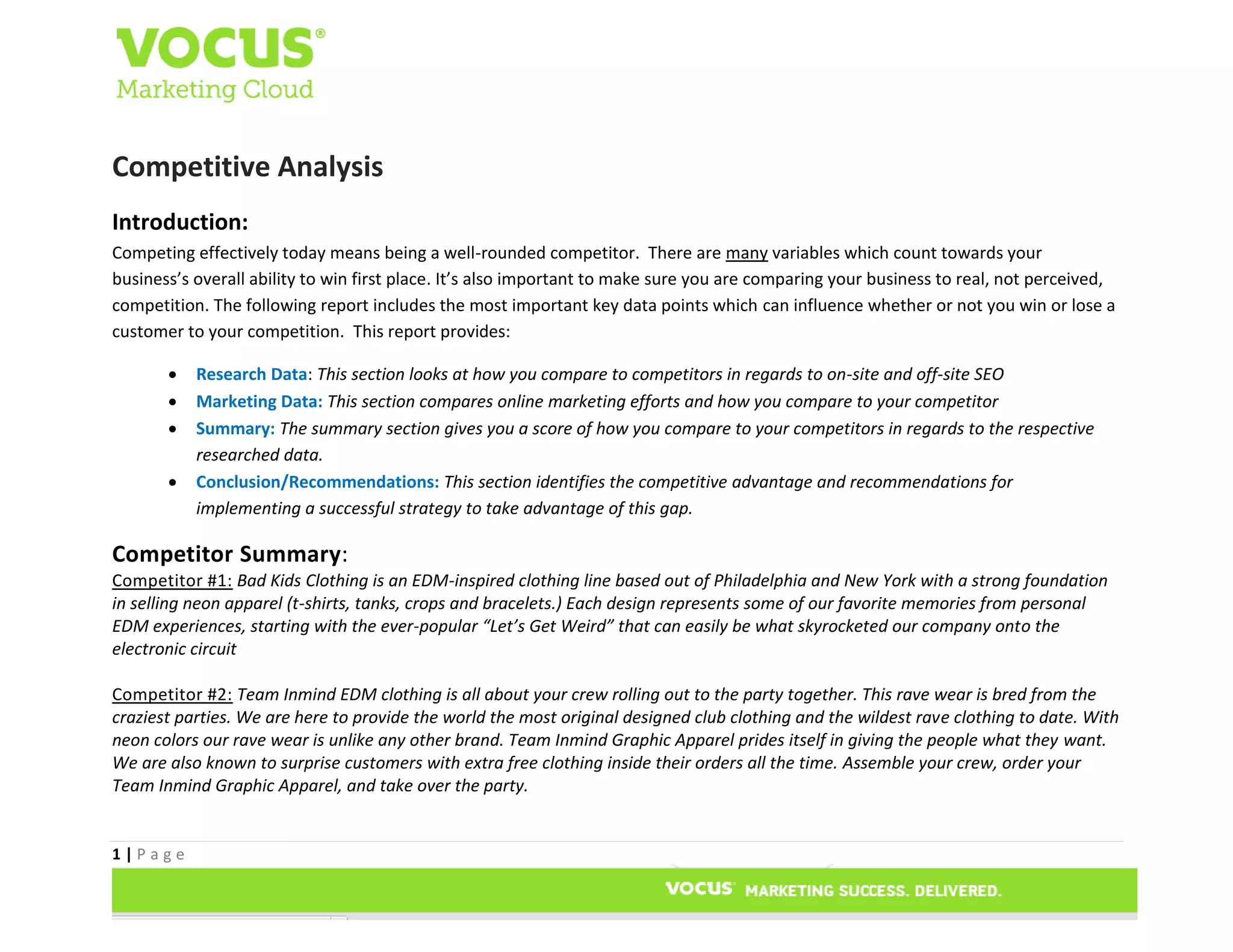 This document provides a competitive analysis of a business and two competitors in the EDM clothing industry. It analyzes their online presence and marketing efforts across several key metrics like SEO, social media, content production, and news/press. The analysis shows Competitor #1 performs the best overall, with higher scores for on-site SEO, social media engagement, and marketing. It finds the business needs to focus more on social media where competitors are succeeding, and engage more with the EDM community through events and brand promotion to drive traffic and sales.