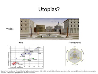 This document discusses a framework for "smart sustainable urban regeneration" (smart-SUR). It proposes that smart-SUR involves three dimensions: 1) Smart institutions that incentivize balanced development, 2) Smart projects that consider both tangible and intangible investments, and 3) Smart funding that de-risks projects and ensures long-term payback. It evaluates sample regeneration projects based on this framework and finds limitations in solely using secondary data. Site visits to projects reveal important institutional and stakeholder dynamics that influence outcomes. The framework emphasizes including stakeholders and independent scientific assessment to help partnerships survive political and economic challenges.