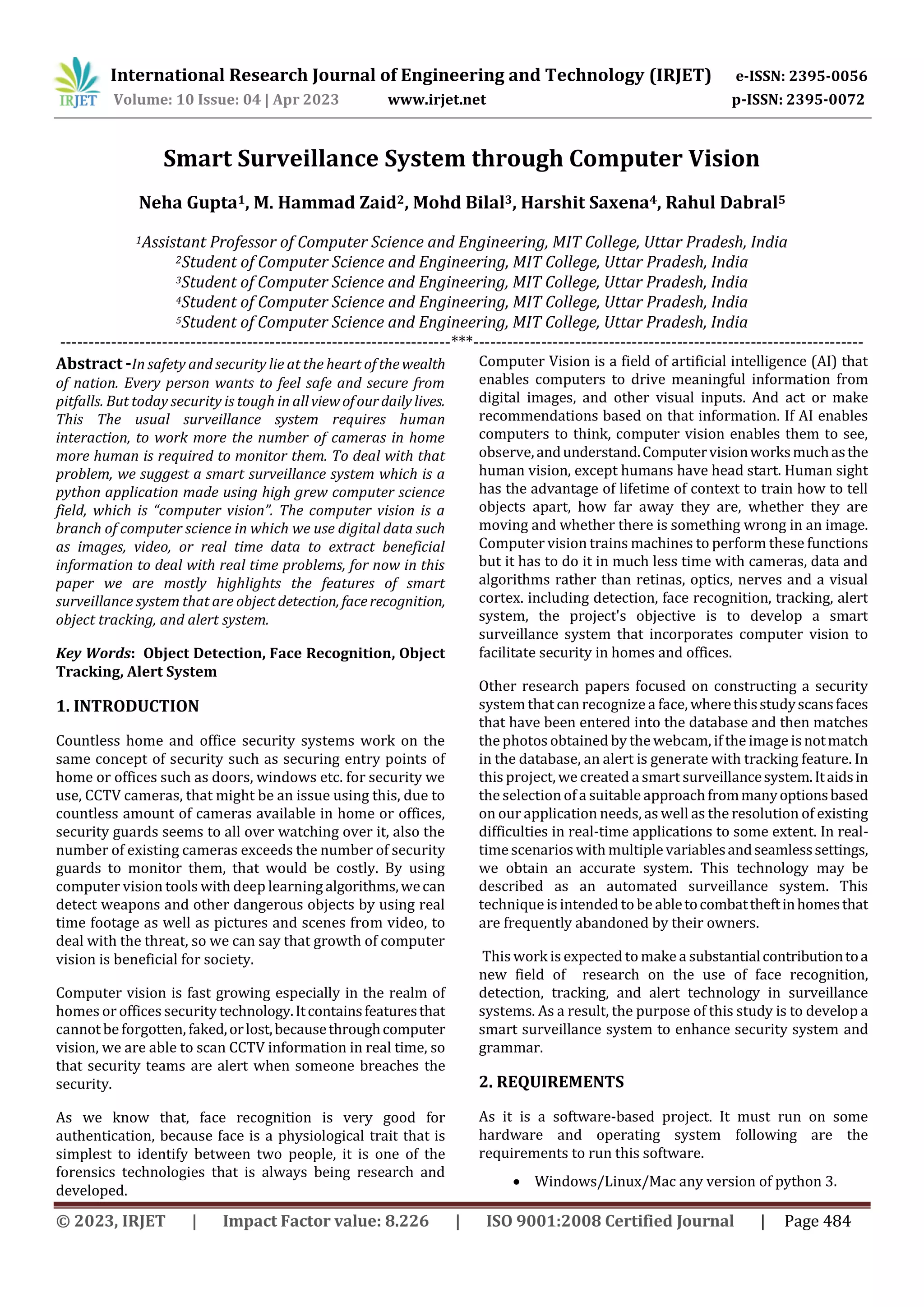 1. The document describes a smart surveillance system that uses computer vision techniques like object detection, face recognition, and object tracking for security purposes in homes and offices.