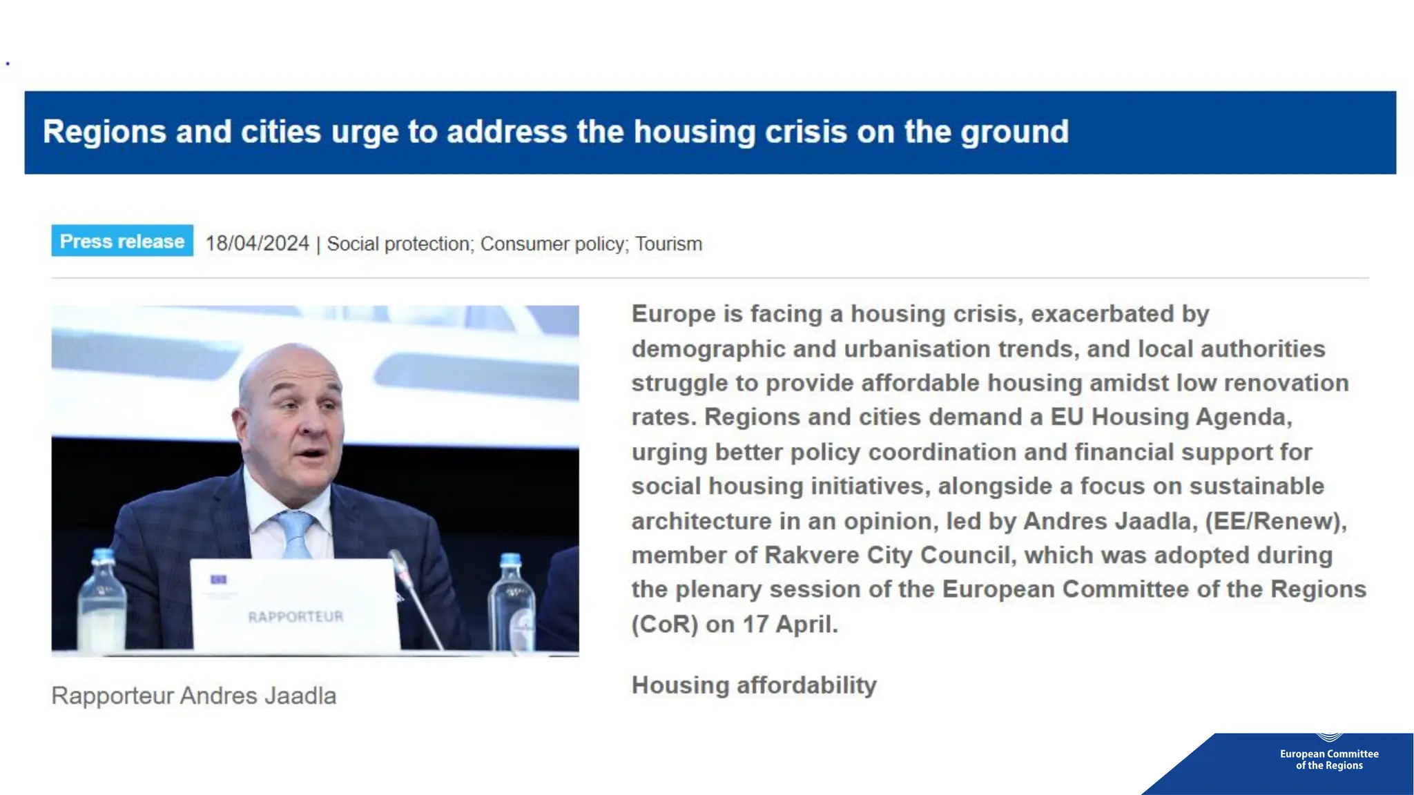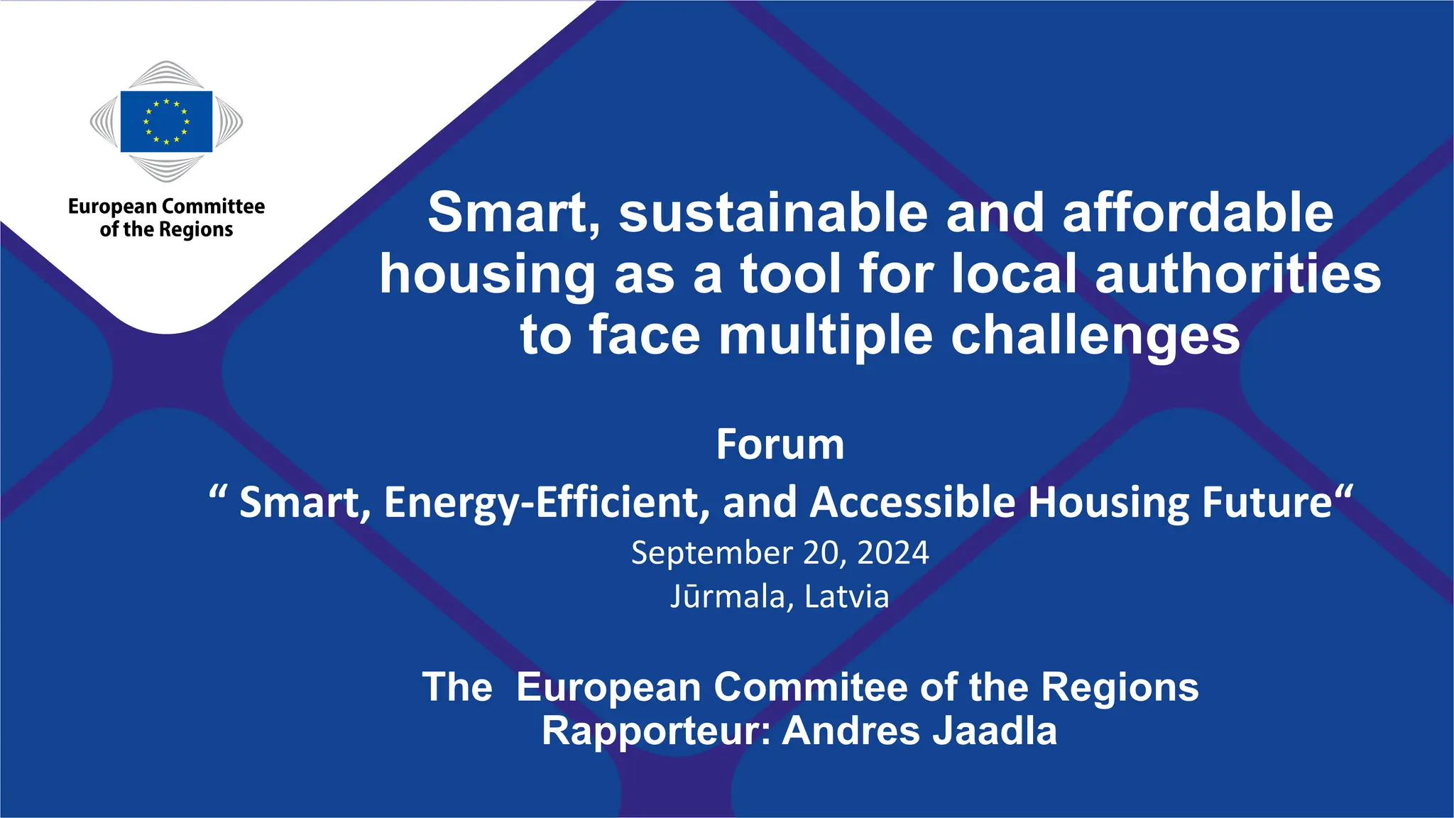 The document discusses the pressing need for smart, sustainable, and affordable housing in Europe, highlighting the challenges posed by crises such as the COVID-19 pandemic, inflation, and climate change. It emphasizes the role of local authorities in improving housing strategies to address affordability issues and support demographic changes. Initiatives for housing renovation and the integration of smart home solutions are explored as key components to enhance energy efficiency and sustainability in the housing sector.