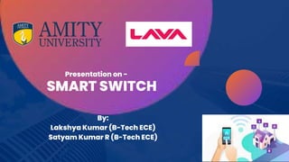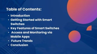 This document introduces a smart switch project using an ESP32 microcontroller and 4-channel relay controlled through a Blynk mobile app. It provides step-by-step instructions on selecting components, setting up the circuit, programming the ESP32, configuring the Blynk app, and testing the smart switch. Key features of smart switches are described such as remote control, scheduling, voice control, remote access, and home automation. Future trends discussed include voice/AI integration, edge computing, interoperability standards, energy harvesting, and enhanced security.