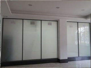 Smart glass, also known as privacy glass or switchable glass, is made from PDLC film sandwiched between two tempered glass panes that can be switched from clear to frosted using electricity. It works as a simple on-off switch and is easy to install like standard double glazing. When powered, smart glass can quickly change from transparent to opaque for privacy or energy efficiency without maintenance.