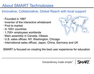 This document discusses Smart Technologies, a company founded in 1987 known for its innovative educational tools such as the interactive whiteboard. With a global presence in over 100 countries and a focus on enhancing user experiences in education, Smart offers various collaborative learning solutions. The company emphasizes quality educational outcomes and collaborative knowledge-building.
