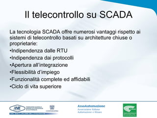 Il documento descrive l'importanza dei sistemi di telecontrollo basati su tecnologia SCADA, evidenziandone i vantaggi in termini di sicurezza, affidabilità e integrazione. Viene analizzata l'architettura tipica di questi sistemi, l'uso di protocolli standard e l'applicazione in vari settori come l'energia e l'acqua. Inoltre, vengono presentati diversi casi di studio, inclusi sistemi in Italia e in India, che dimostrano l'efficacia e la flessibilità della tecnologia SCADA.