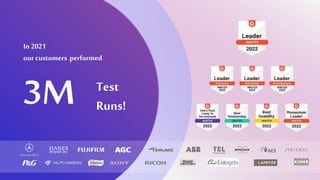 The document summarizes the participation of various industry leaders in a test dynamix executive customer panel held in February 2022, highlighting their company's revenue, founding details, and number of employees. It discusses the efficiency of AI-powered change analysis for testing processes, emphasizing the benefits of speed, visibility, control, and improved delivery quality. The panel features executives from notable companies including SAP and a women's fashion clothing brand.