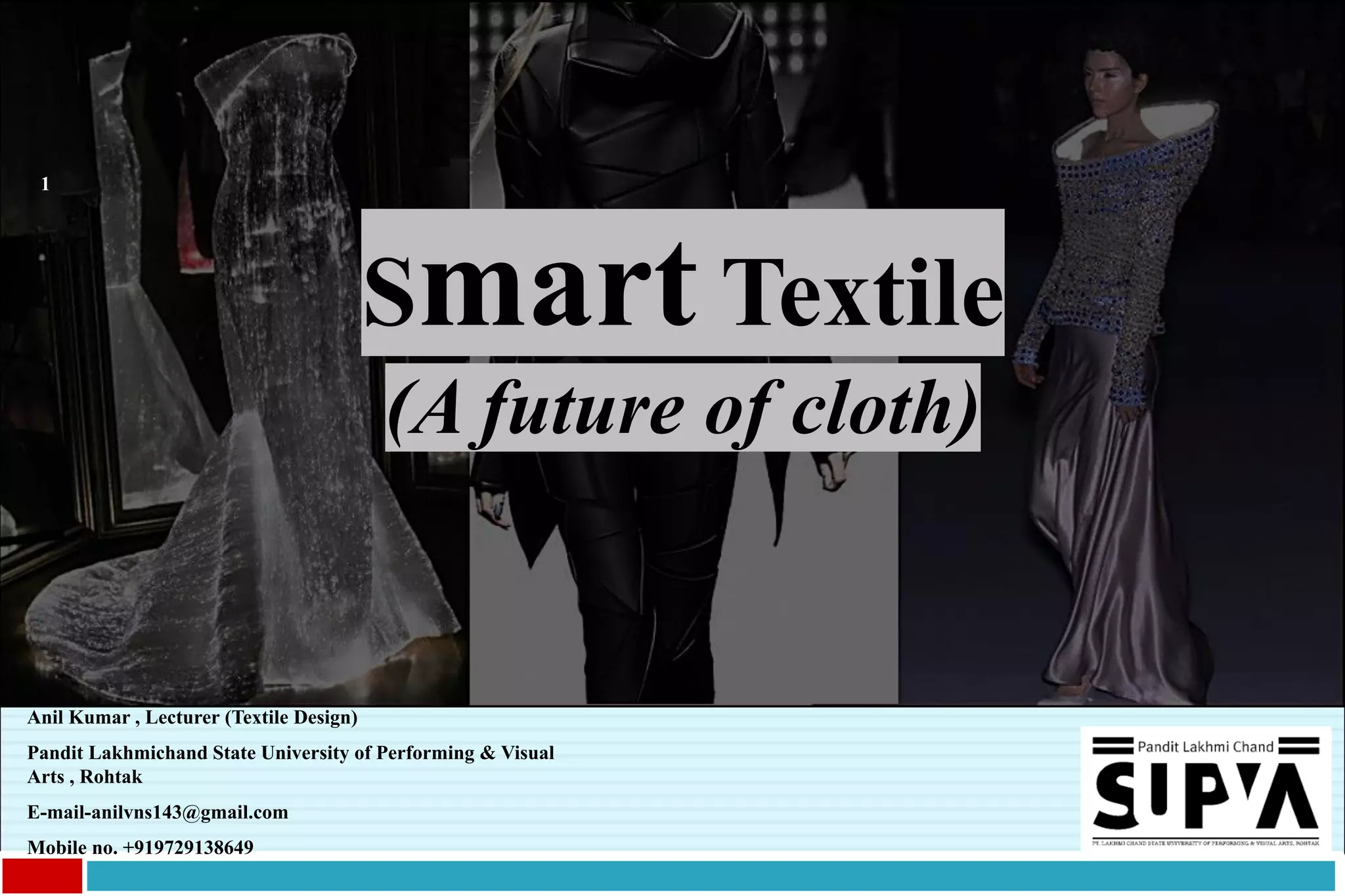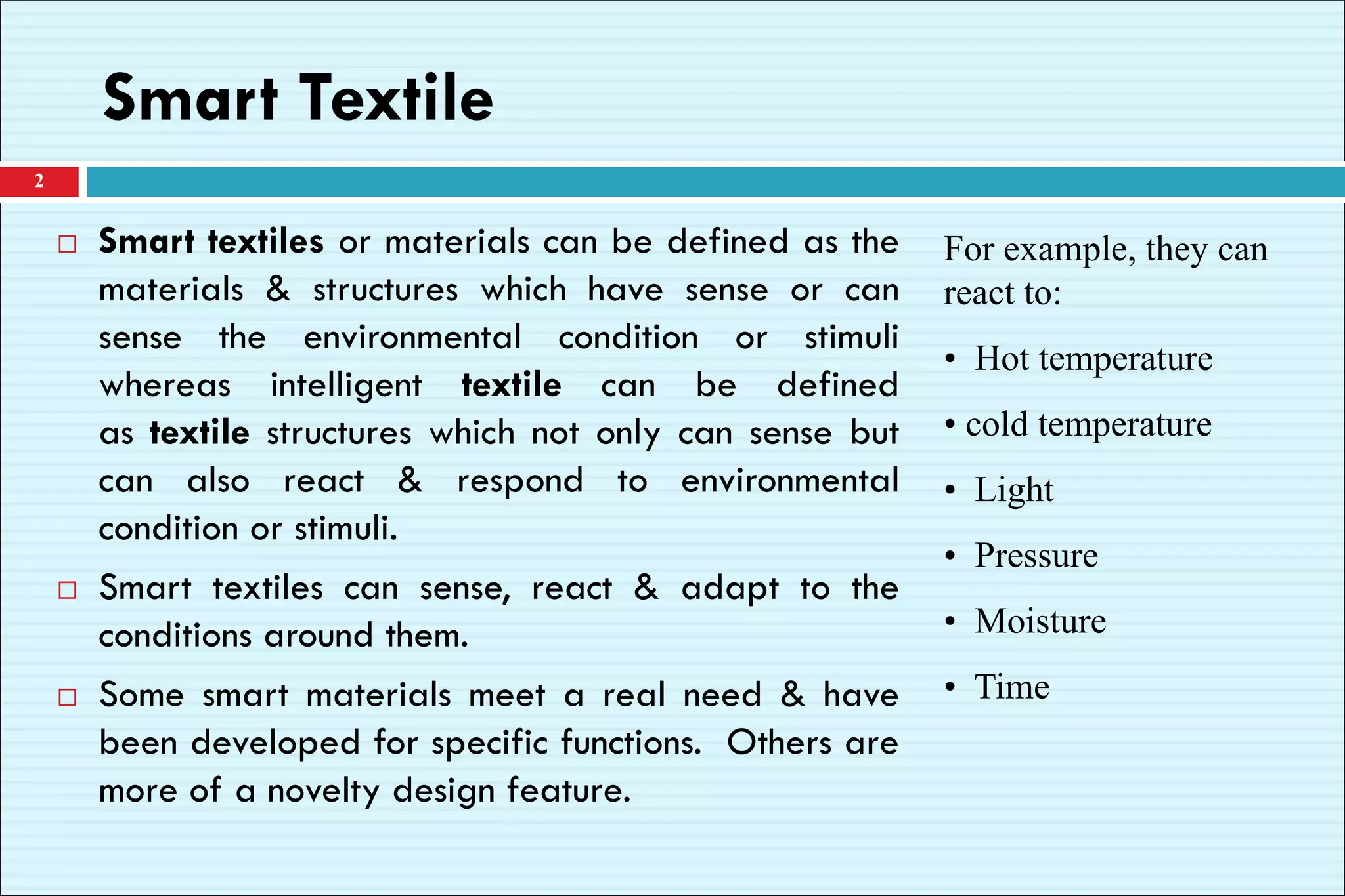 Smart textiles are materials that can sense and react to environmental stimuli such as temperature, light, and pressure, allowing them to adapt to changing conditions. Examples include thermochromic textiles that change color based on temperature and electronic textiles that integrate communication technology. These innovations have various applications ranging from novelty clothing to medical uses and safety equipment.