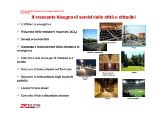 Il documento discute l'importanza della mobilità sostenibile e l'implementazione di servizi smart nelle città, evidenziando l'accordo per la creazione dello smart services cooperation lab in Italia. Si sottolinea come i servizi intelligenti possano migliorare l'efficienza energetica, ridurre le emissioni inquinanti e supportare la gestione urbana con soluzioni innovative. Infine, viene riportato che già 51 comuni stanno adottando questi servizi innovativi per affrontare diverse necessità locali.