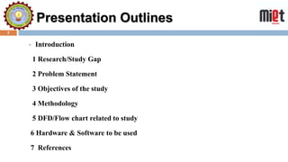 The document discusses a proposed smart traffic management system using cloud technology. It outlines the introduction, research gap, problem statement, objectives of the study, proposed methodology, data flow diagram, hardware and software to be used, and references. The system aims to optimize traffic flow and reduce congestion using IoT sensors, cloud-based data collection and analysis, and coordinated traffic management between agencies.