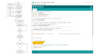 The document describes a "Smart Tub" project that aims to develop a system to consistently control water temperature in bath tubs. The system uses a temperature sensor and heating coil controlled by an Arduino board to monitor and adjust the water temperature. It also lists objectives of the project, a block diagram of the system components, and a bill of materials for the hardware required. The conclusion states that the smart tub provides automated control and monitoring of the water temperature and that future work could expand its features.