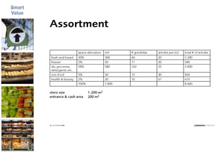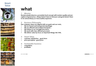 The document provides a business plan summary for a proposed Russian food retail chain called Smart Value Food Retail between 2007-2010. It aims to seize market opportunities by opening ~35 stores and reaching over $300 million in annual sales by 2010. Key aspects of the plan include finding investors, researching the market and consumer needs, establishing an experienced international management team, developing a "smart value" concept focused on price and quality, implementing best practices from European retailers, and forecasting continued growth through expanding store count and sales.
