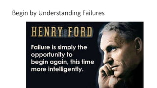 The document discusses solving complex engineering problems creatively. It talks about understanding failures by using a model that examines intention, behavior, and events. It then provides an example of analyzing the failure of a bearing, looking at the inner race crack, rollers, and bush using a dynamic representation over space and time. It concludes by discussing potential plans and improvements that could be made, such as changing the oil type and adding a breather or electrostatic cleaner.
