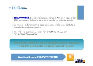 Smart Work S.r.l. è una società di consulenza milanese operante dal 2004, dedicata al settore agroalimentare e mirata a supportare le aziende nella crescita commerciale e nello sviluppo internazionale. Offre servizi unici e integrati, tra cui ricerca di distributori, supporto marketing e gestione di reti commerciali. I vantaggi della collaborazione con Smart Work comprendono expertise nella gestione delle risorse, approccio sistemico e risparmi nei costi di personale, con un'esperienza di oltre 10 anni nel settore.