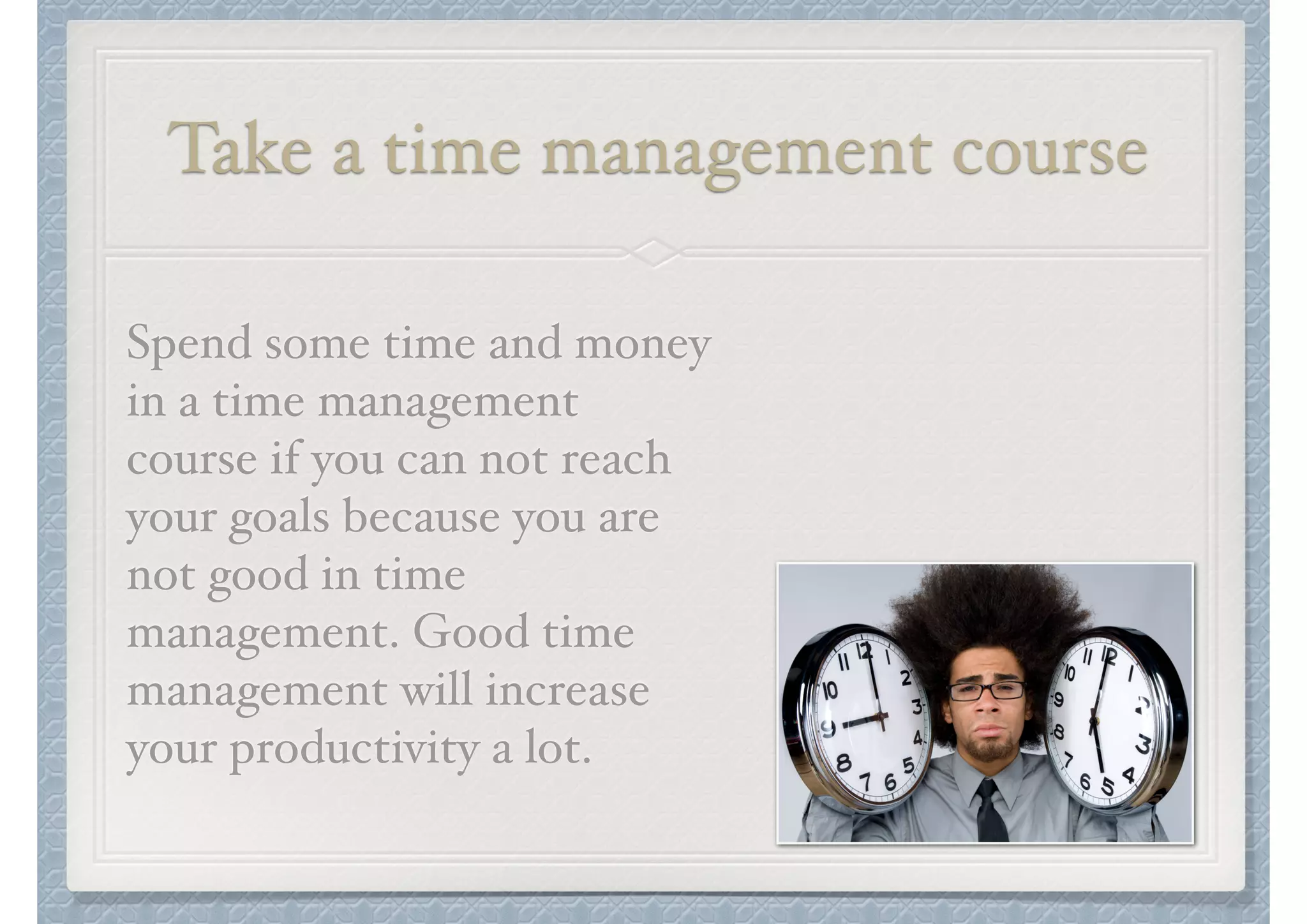 The document provides tips for improving time management. It recommends taking a time management course, scheduling to-do items as appointments to avoid distractions, breaking large tasks into smaller steps for a sense of accomplishment, avoiding wasting time on unproductive activities like social media, delegating tasks when possible, preparing for tasks to avoid procrastination, being flexible if goals aren't met one day, getting organized to reduce wasted time, taking breaks to avoid stress, and rising early to accomplish more before others wake up. It concludes by advertising the CoWorks shared office space for productive work.