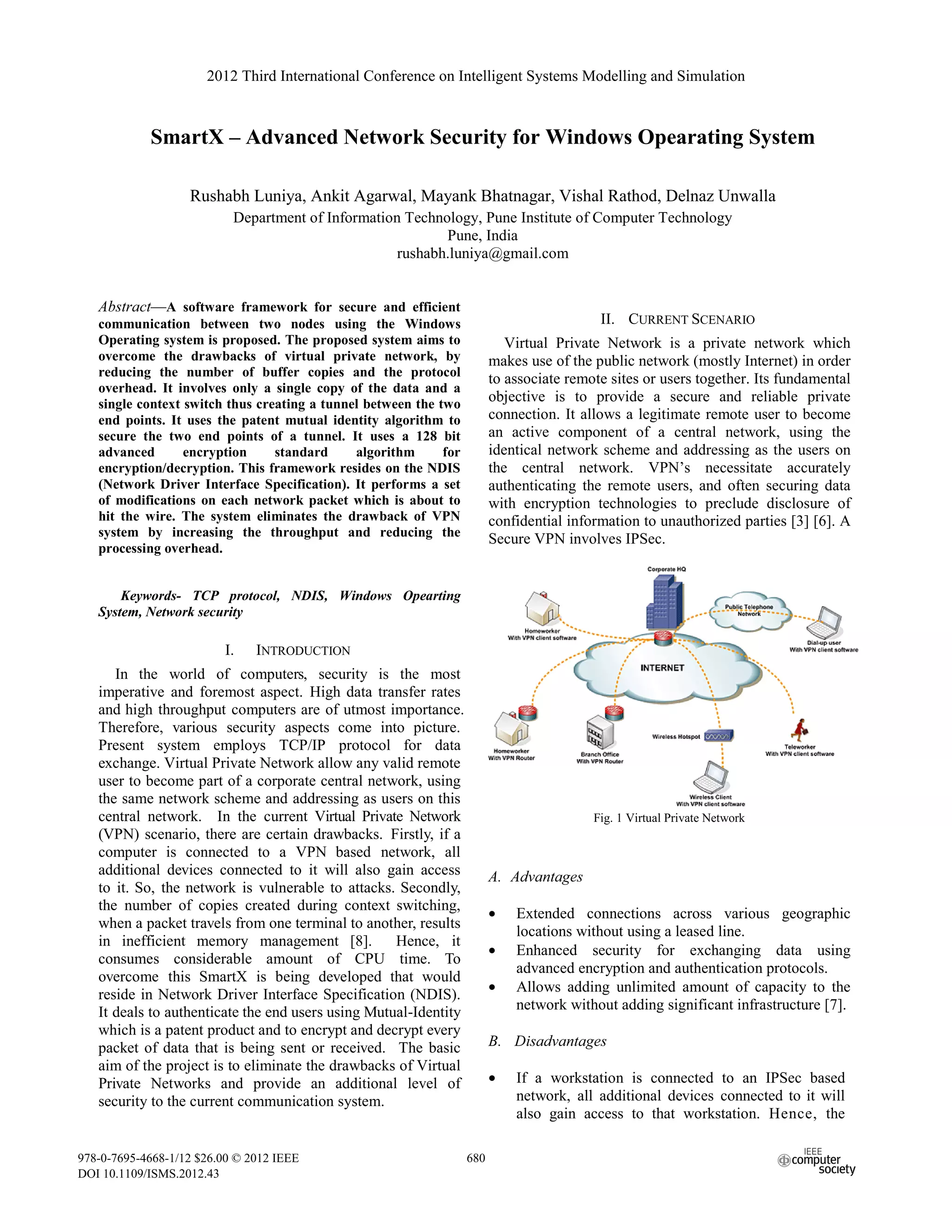 This document describes a proposed software framework called SmartX that aims to provide advanced network security for the Windows operating system. SmartX seeks to overcome drawbacks of virtual private networks (VPNs) by reducing buffer copies and protocol overhead during network packet transmission. It uses a mutual identity algorithm for authentication between endpoints and 128-bit AES encryption of packets. The framework would reside in the Network Driver Interface Specification (NDIS) and modify packets before transmission to provide secure and efficient communication with reduced processing overhead compared to standard VPNs.