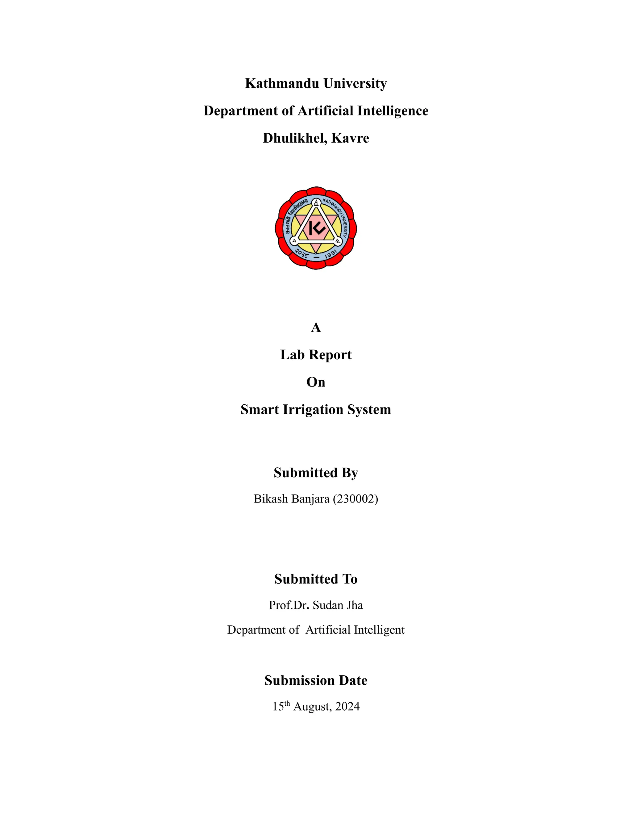 The document outlines a lab report on a smart irrigation system designed by Bikash Banjara at Kathmandu University, focusing on automating lawn sprinkling based on real-time water level data. The system utilizes IoT devices to monitor soil moisture and activates sprinklers when necessary, aiming to reduce water waste in gardening and agricultural contexts. The report details the materials, methods, and results, demonstrating the effectiveness of the system in optimizing water usage.