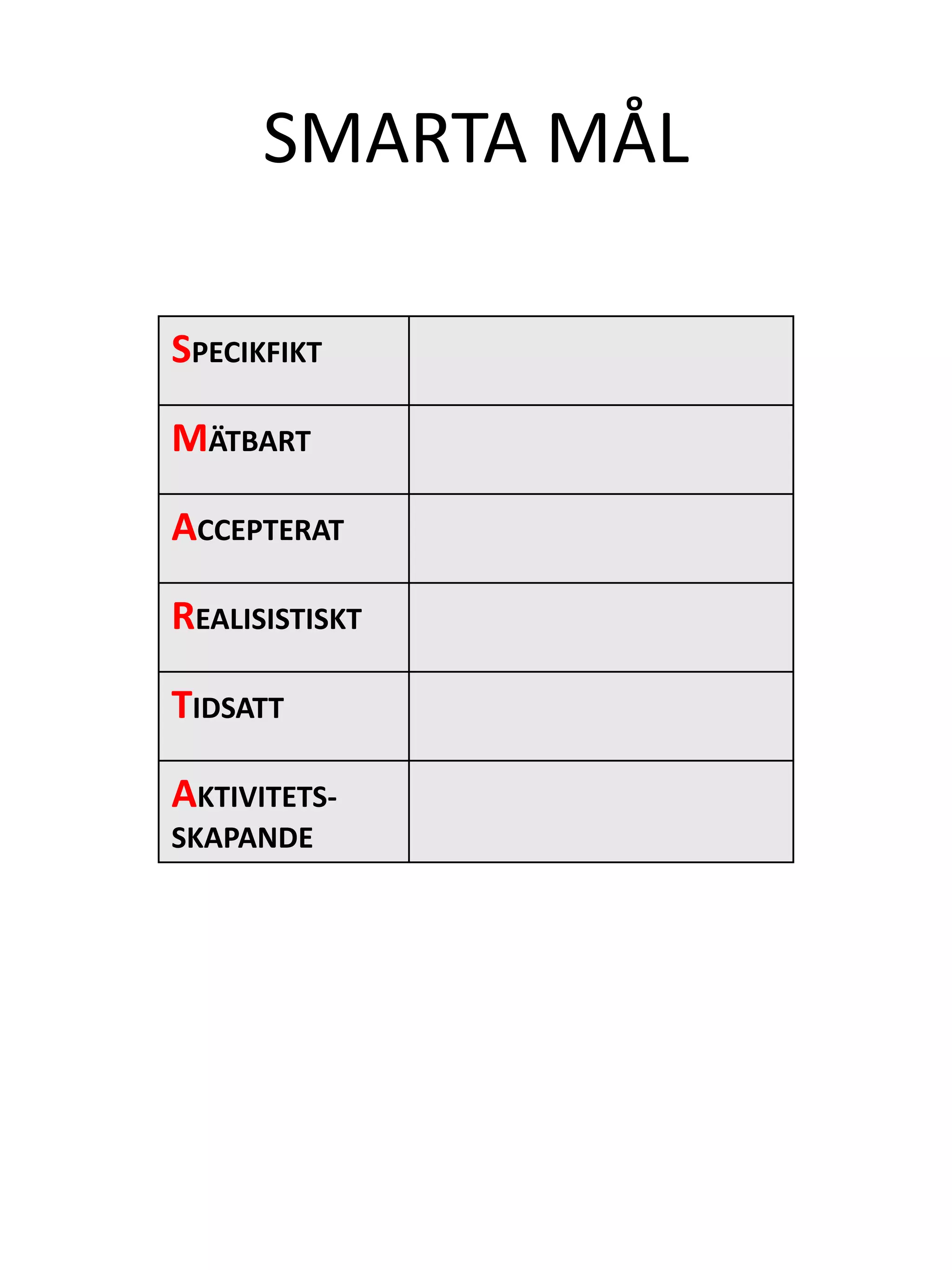 SMARTA MÅL is an acronym for setting goals that are Specific, Measurable, Accepted, Realistic and Time-bound in order to create an action plan. Goals should be clearly defined, quantifiable, agreed upon by those involved, achievable given available resources, and include deadlines to work towards and track progress. Properly setting SMARTA MÅL helps ensure goals are effectively pursued and achieved.