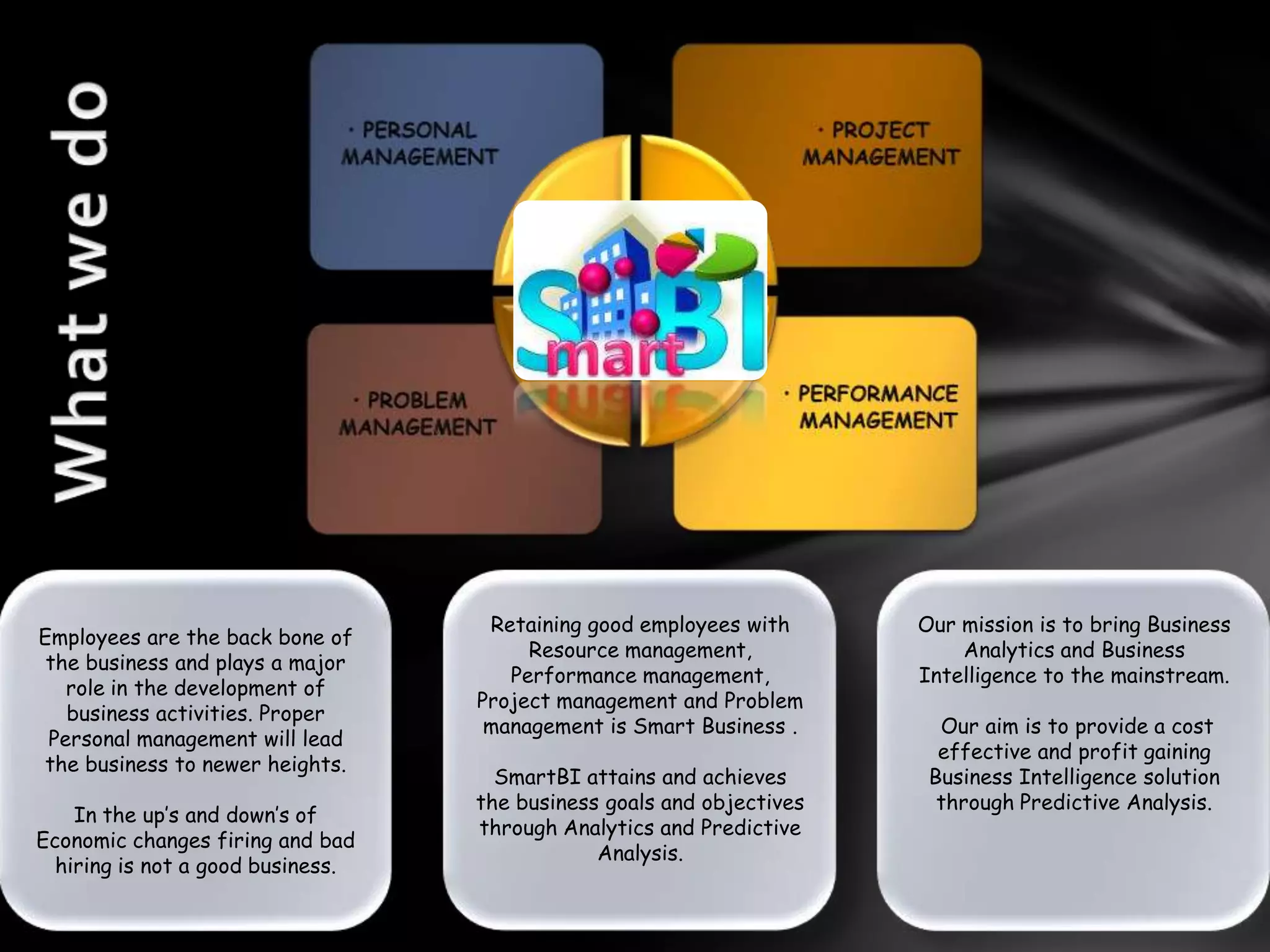 SmartBI aims to make business intelligence accessible to all through affordable and effective analytics solutions that help retain good employees, achieve business goals through predictive analysis, and provide cost-effective intelligence to boost profits. Their mission is to bring analytics and business intelligence mainstream through solutions that analyze employee performance, resource management, projects, and problems to help businesses navigate economic changes smoothly.