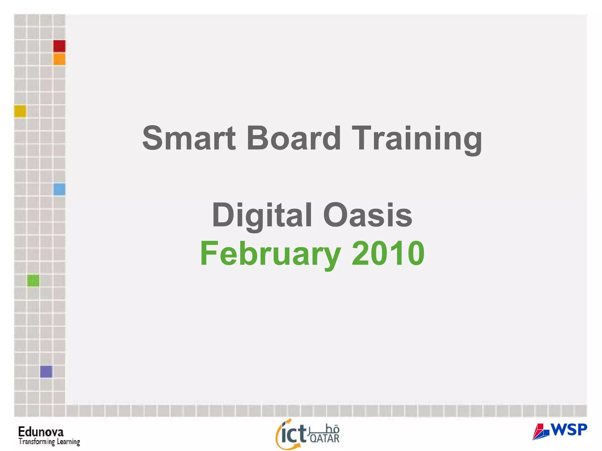 This document provides an overview of training for using an interactive whiteboard. It begins with basic setup and use, including connecting wires, calibration, using pens and erasers, and the toolbar. More advanced topics covered include setting up files and folders, using tools like shapes and attachments, and specific applications for subjects like math. The document recommends practice and references additional online resources and tutorials. It concludes with which teaching standards are addressed through use of the interactive whiteboard.