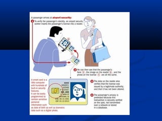 This document discusses smart cards, including their history, components, applications, and future uses. Smart cards contain embedded microchips that can store data and be used for various applications like payments, identification, and transportation ticketing. They provide security benefits over magnetic stripe cards. Some key uses mentioned include banking/finance, mobile phones, transportation, ID cards, and future growth areas like contactless services. By 2020, it is estimated there will be 20 billion smart secure devices in use globally across many industries.