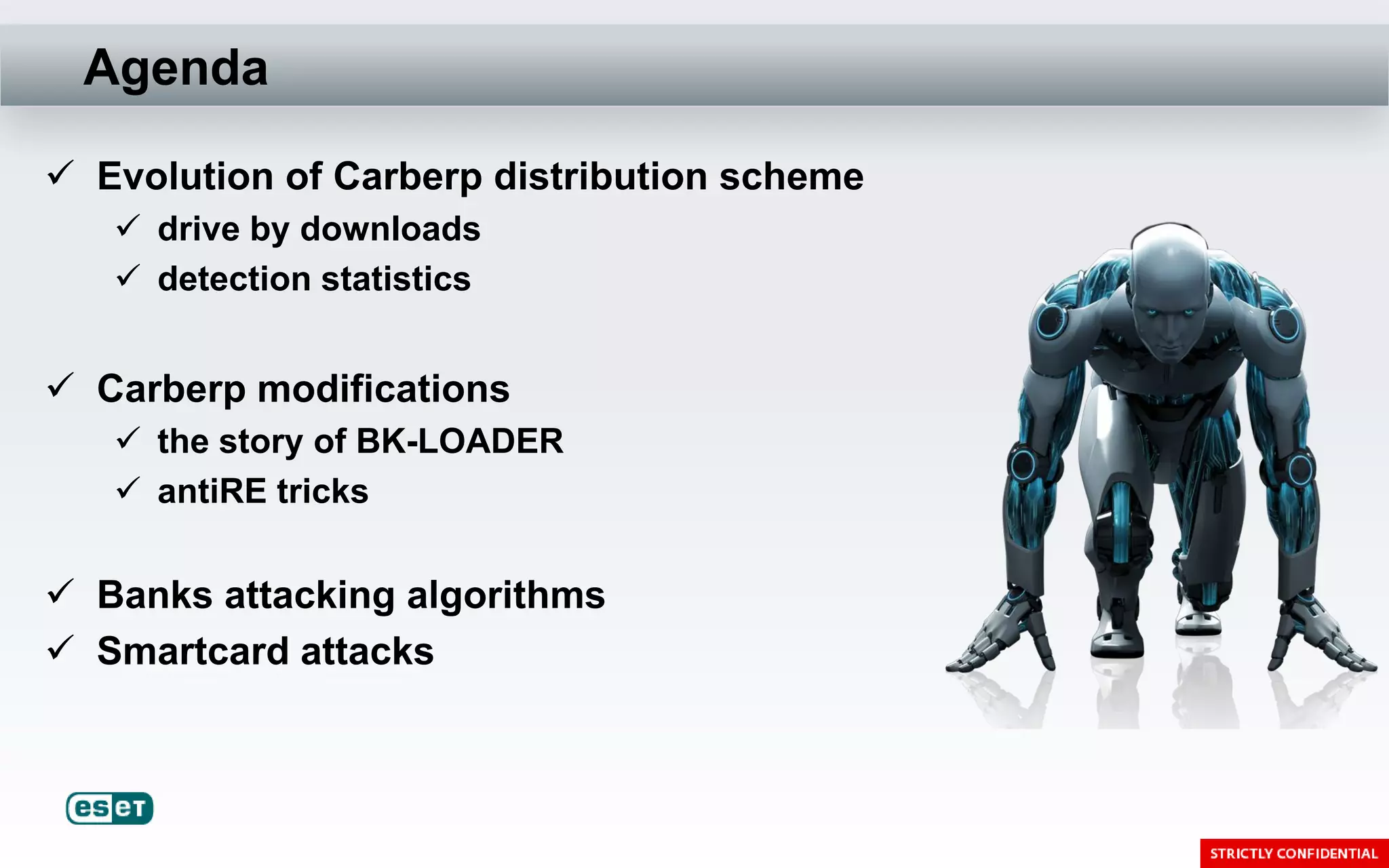 This document discusses the evolution of Carberp malware and its distribution methods, modifications to increase functionality and evade detection, techniques for attacking banks and stealing financial information, and vulnerabilities in smartcard technology exploited by malware. It provides details on Carberp's transition from drive-by downloads to using exploit kits, the creation of new variants like BK-LOADER with bootkit capabilities, and tactics for intercepting user activities and encrypting communications to remain covert.