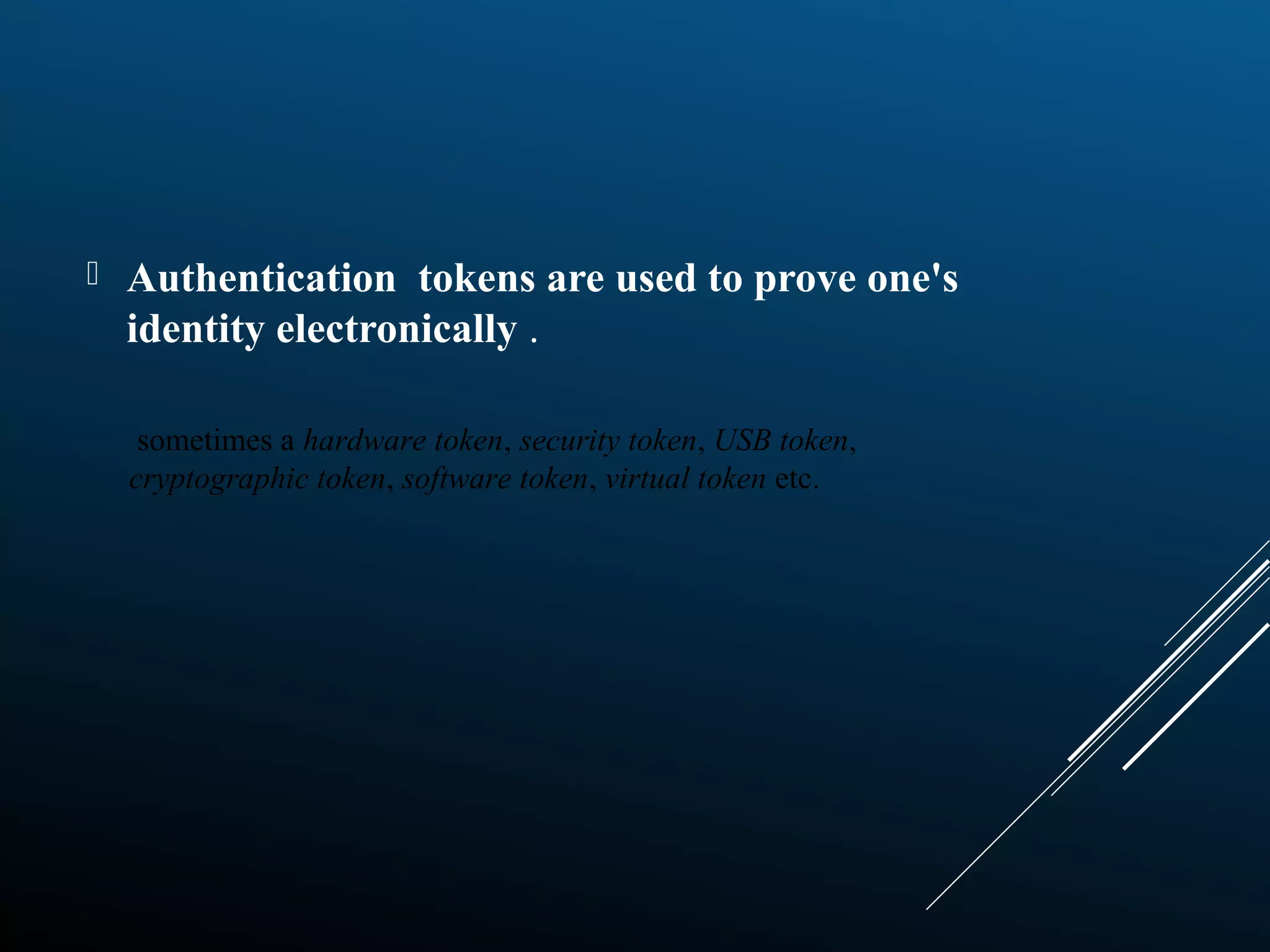 Authentication tokens are used to prove one's identity electronically. They can be hardware or software based, and use passwords, cryptographic keys, or biometric data to authenticate users. Time-synchronized one-time password tokens generate new passwords constantly, while algorithm-based tokens use complex math to generate unguessable one-time passwords. Connected tokens transmit authentication data automatically when connected, while disconnected tokens require manual entry of generated passwords. Smart cards are a type of disconnected token that store and process data using an embedded microchip, providing secure multi-factor authentication through passwords, cryptography, and potentially biometric data.