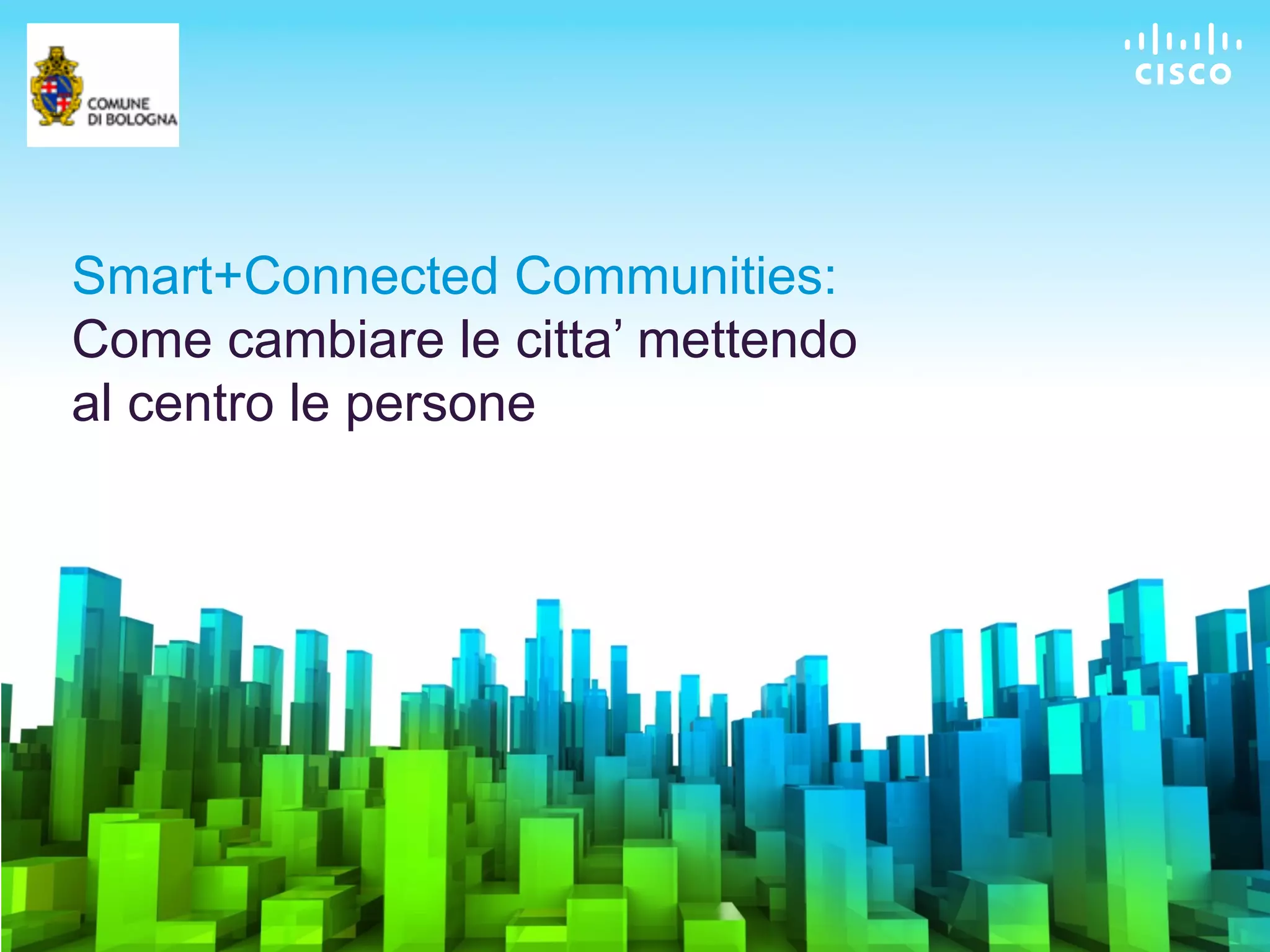 The document discusses smart and connected communities and how technology can help solve social problems. It provides examples of how technologies like telepresence and video can improve healthcare by providing remote access to experts, education through virtual classrooms, and energy through smart grids. The remainder summarizes a Cisco solution that uses remote expert pods to provide virtual government services, reducing costs and travel while improving citizen access to experts. Sensors and videoconferencing enable remote consultations, with examples of installations in Bologna, Italy.