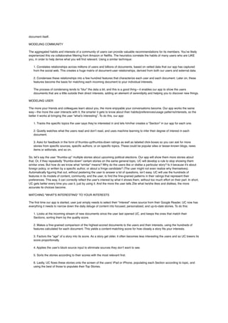 The document describes how a news reading app can provide personalized content recommendations by leveraging what it learns about a user's interests from their social media accounts and reading habits. It outlines how the app would monitor social networks, analyze content and user interactions to build models of individual users and communities. These models are then used to select and rank news stories that closely match a user's interests to create a personalized news experience tailored to each reader.