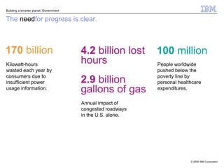 The document discusses the need for governments to embrace smarter practices to address global economic challenges and improve citizen services. It outlines strategies for enhancing collaboration, efficiency, and sustainability in public services while addressing issues such as demographics, globalization, and environmental concerns. Governments are encouraged to leverage technology and data for better decision-making and resource management to drive transformative changes in society.