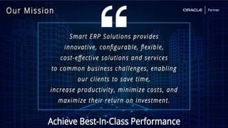 This document summarizes the services provided by SmartERP Solutions, an implementation partner for Oracle, NetSuite, PeopleSoft, and JDE solutions. They have over 300 clients worldwide across various industries and 350+ employees. They offer solutions and services around ERP implementations including PeopleSoft, security assessments, access reviews, segregation of duties analysis, and reporting on access and security as a subscription service. They aim to help organizations comply with various data security and privacy regulations.
