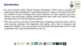 This study examined farmers' perspectives on the adoption of smart farming techniques (SFT) in Jangoan Mandal, Telangana, India. Semi-structured interviews were conducted with 100 farmers to understand their use of SFT, perceived benefits and challenges, and the impact on their livelihoods. The results showed that most farmers saw benefits of SFT such as increased yields and reduced environmental impact. However, high costs, lack of training and infrastructure posed adoption barriers. While SFT has potential to improve sustainability and productivity, more support is needed to assist small farmers in adopting these new technologies.