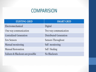 The document discusses the concept of smart grids, which modernize traditional electrical grids by enabling bi-directional energy flow and real-time communication. Key benefits include more efficient electricity transmission, quicker restoration after disturbances, and the integration of renewable energy sources. It also highlights the components, architecture, and ongoing projects in India aimed at implementing smart grid technology.
