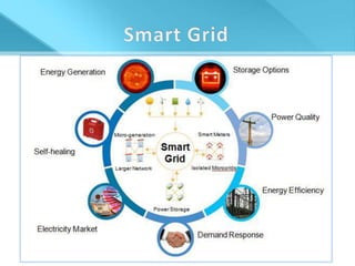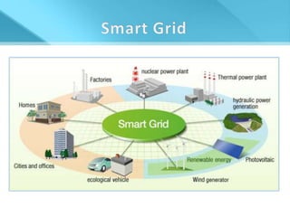 The document discusses the history and goals of smart grids, including modernizing energy transmission and distribution networks. It describes how smart grids use digital technologies, two-way communication, and automation to improve reliability, efficiency and integration of renewable energy. Some key benefits are enabling consumer participation through demand response, reducing peak demand, and allowing easier integration of electric vehicles and distributed generation. The document also outlines some technical aspects and challenges to wider smart grid adoption.