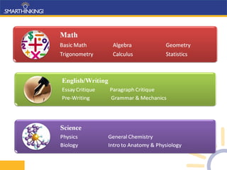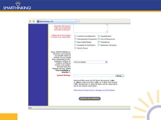 SMARTHINKING provides online tutoring services to students and institutions, offering over 2 million tutoring sessions and essay critiques. It employs over 900 tutors with advanced degrees to provide private, on-demand tutoring sessions to supplement academic support. Studies show students using SMARTHINKING services have improved grades by up to 33% and increased pass rates by 12%, with higher retention rates compared to non-users.
