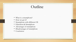 The document outlines what a smartphone is, its history, operating systems used, and how smartphones impact education. A smartphone is a mobile phone that performs computer-like functions with features like internet access and apps. Theodore Paraskevakos first conceptualized smartphones in 1971. Smartphones run various operating systems like Android, iOS, Windows Phone and more. In education, smartphones can be used as dictionaries, for research, note-taking, and scheduling. While smartphones save time and provide access to information, they can also be distracting and overuse is costly.